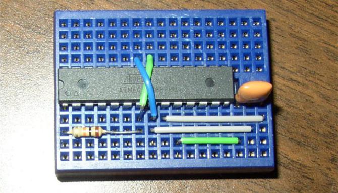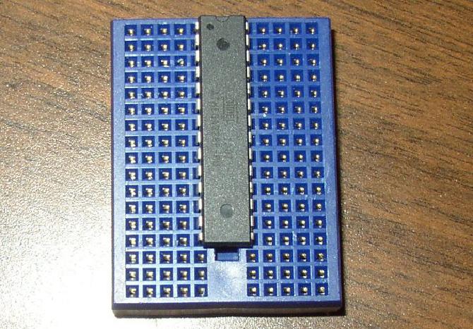 Put the ATMega328 in the breadboard, with the little semicircular cutout facing one end of the breadboard.